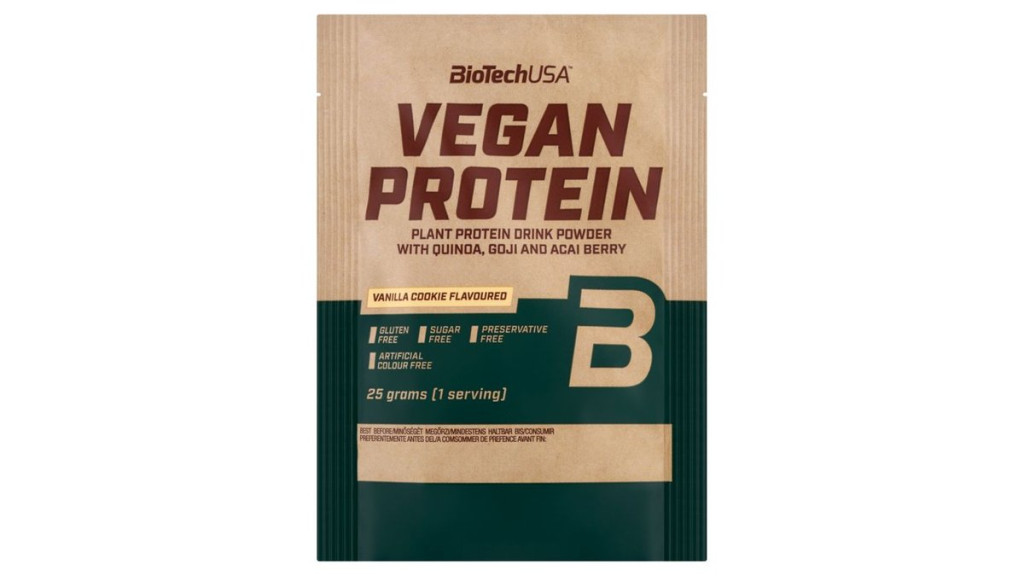 BioTechUSA Vegan Protein cukormentes vaníliás sütemény ízű fehérje italpor édesítőszerekkel 25 g